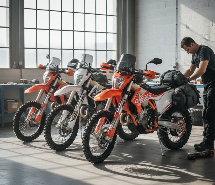 Our fleet is built exclusively around 4-stroke KTM EXC-F, Husqvarna FE and GasGas EC models. The most common engine sizes we use are 250 and 350, selected for their reliability and performance in real trail conditions.